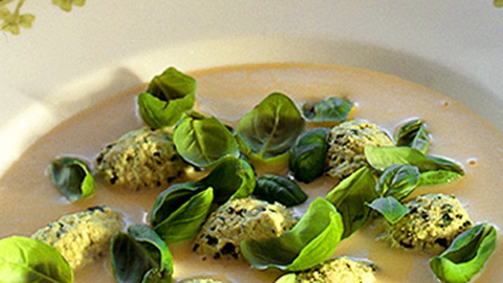 3. Kuumenna keitto kiehuvaksi ennen tarjoilua ja suolaa tarvittaessa, riippuen liemen suolaisuudesta. Mausta myös cayennepippurilla. Ripottele päälle tuoreita basilikanlehtiä.