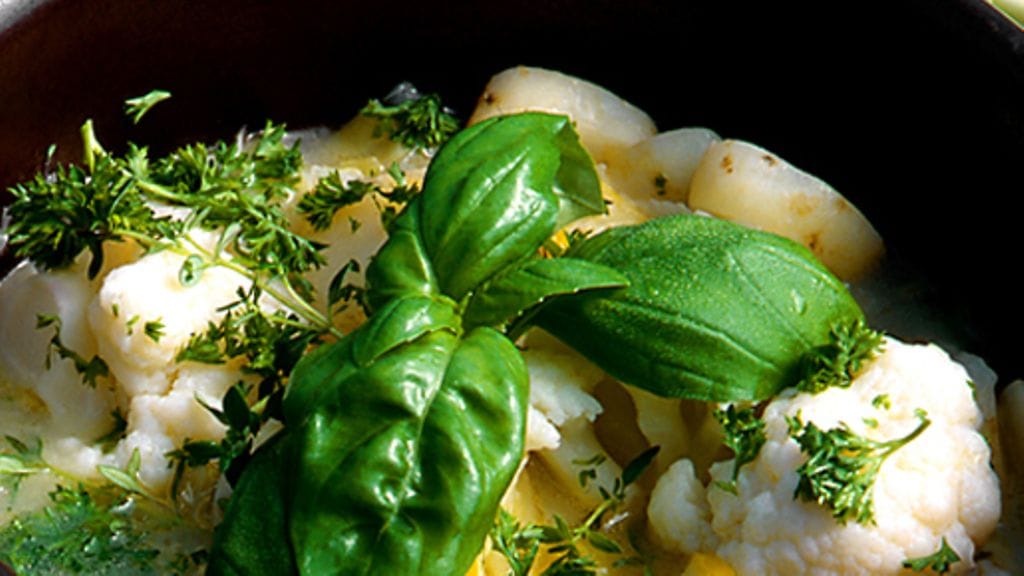 2. Kuumenna kiehuvaksi ja alenna lämpöä. Hauduta kannen alla, kunnes kukkakaali on pehmennyt, n. 10 minuuttia. Maista ja suolaa.