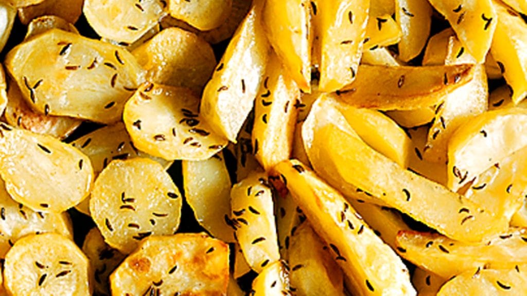 2. Laita perunat uunivuokaan tai suureen paistinpannuun. Suolaa ja ripottele päälle kuminaa.