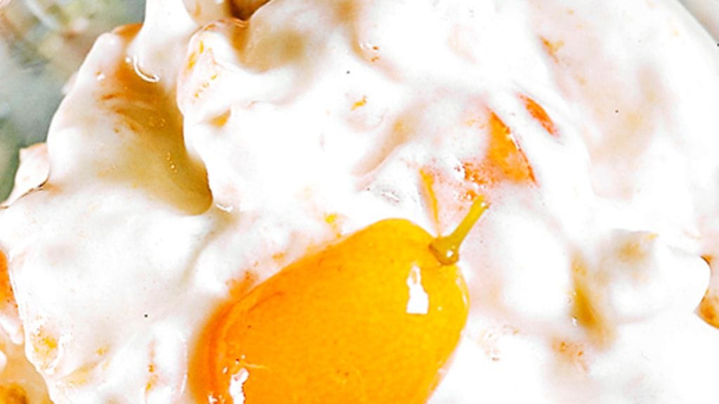 3. Täytä neljä annoslasia kumkvattijogurtilla ja koristele kokonaisella hedelmällä.