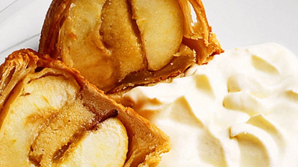 3. Jaa murotaikina viiteen osaan. Kauli palat levyiksi ja kääri omenat neljään niistä ja voitele munalla. Leikkaa veitsellä tai taikinapyörällä 8 suikaletta lopputaikinasta. Laita ne ristiin jokaisen omenan päälle. Penslaa munalla ja paista uunissa 30 minuuttia.