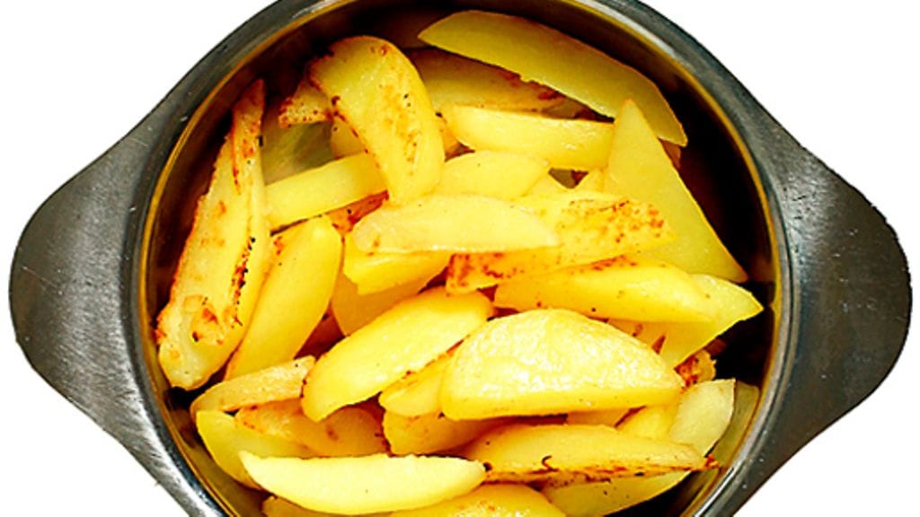 1. Kuori perunat ja leikkaa ne lohkoiksi, laita ne sitä mukaa kylmään veteen. Kaada sitten perunoista vesi pois ja kuivaa lohkot puhtaalla keittiöpyyhkeellä.