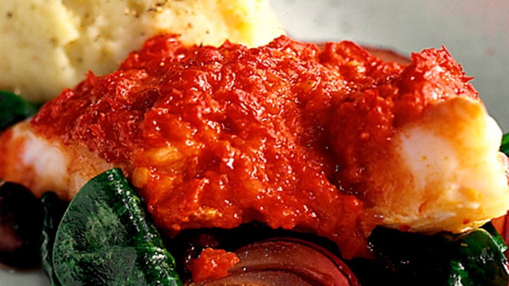 3. Kuori ja lohko punasipuli. Perkaa pinaatit, leikkaa paksut lehtiruodit pois ja pieni isoimmat lehdet. Kuullota sipulia voissa, kunnes pehmeää, kääntele sekaan pinaatti ja kuumenna. Lusikoi seos lämpimälle tarjoiluvadille, nosta kalapalat päälle ja tarjoile puikulasoseen kera.