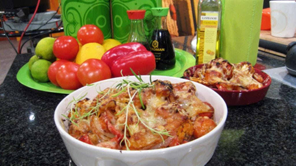 Kun kaikki kasvikset ovat mukana, lisää tomaattipyree ja mausta suolalla, pippurilla ja yrteillä. Hauduta hetki. Voitele uunivuoka öljyllä. Kumoa vihanneshöystö siihen ja ripottele juustoraaste pinnalle. Kuorruta uunissa grillivastuksen alla niin, että juusto sulaa ja saa hiukan väriä pintaansa. Tarjoa sellaisenaan tai riisin tai pastan kanssa.