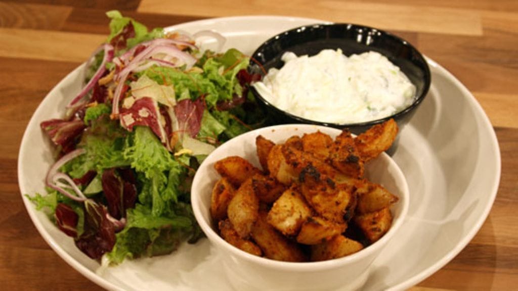 Revi ja pese sekä kuivaa salaatit. Viipaloi tomaatit sekä kurkku. Kuori ja leikkaa sipuli ohuiksi viipaleiksi. Sekoita salaatti, mausta suolalla ja mustapippurilla sekä oliiviöljyllä.