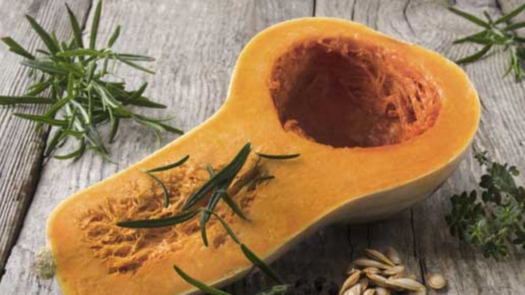 - Lisää pannulle voi, kurpitsanpalat, perunat ja pippuri, ja paista muutaman minuutin ajan.