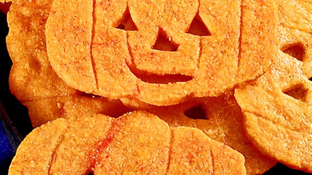 2. Kaulitse taikina 3-4 mm paksuiseksi levyksi. Leikkaa mallien avulla kurpitsoja ja laita ne leivinpaperille pellille.