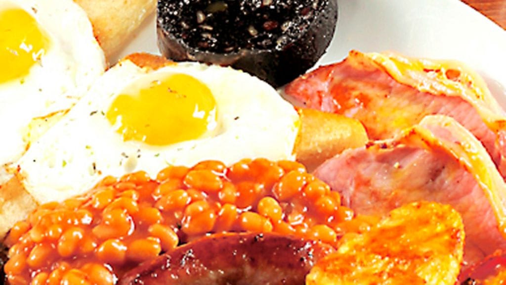 3. Asettele makkarat, pekoni, sienet, tomaatit, pavut ja hash brownsit neljälle lämpimälle lautaselle. Laita munat suoraan pannusta lautasille. Tarjoile heti.