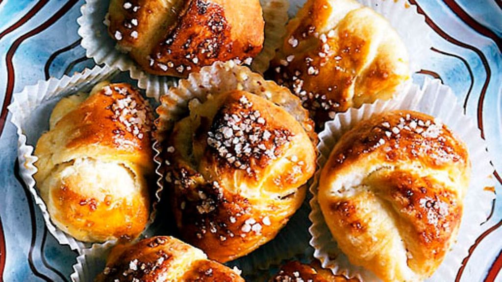 4 Kuumenna uuni 200 asteeseen. Penslaa pullat vispatulla munalla ja ripota pinnalle raesokeria. Paista 12-15 minuuttia.