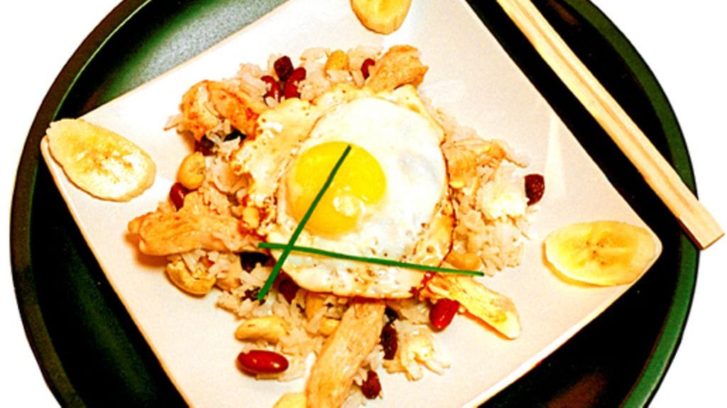 2. Riisin valmistuttua sekoita siihen rusinat, valutetut pavut, pähkinät ja broilerinsuikaleet. Lämmitä riisiseos.