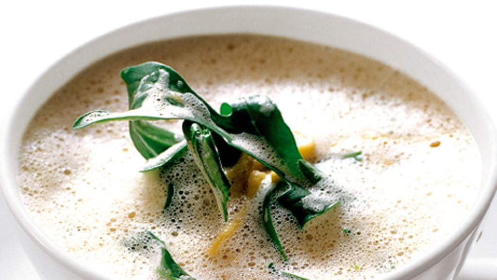 3. Pane rucola ja vastakeitetyt nuudelit kulhon tai cappuccino-kuppien pohjalle ja kaada päälle kuohkea keittoliemi.