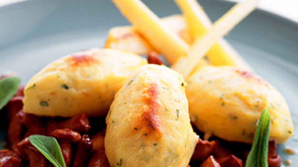 2. Kuumenna vettä ja suolaa suuressa kattilassa. Muotoile aika löysä taikina vedellä huuhdotuin käsin 12 palloksi (kvenelliksi). Laita ne kuumaan veteen, yksi kerrallaan ruokalusikan avulla, ja keitä kannen alla n. 10 minuuttia.