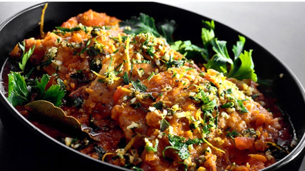 2. Kalttaa ja kuori tomaatit, lohko ne ja poista siemenet. Silppua persilja karkeasti ja laita tomaattien kanssa pataan. Kaada päälle lihaliemi ja viini, mausta timjamilla, oreganolla ja laakerinlehdellä. Kuumenna kiehuvaksi ja anna poreilla kannen alla noin 30 minuuttia.