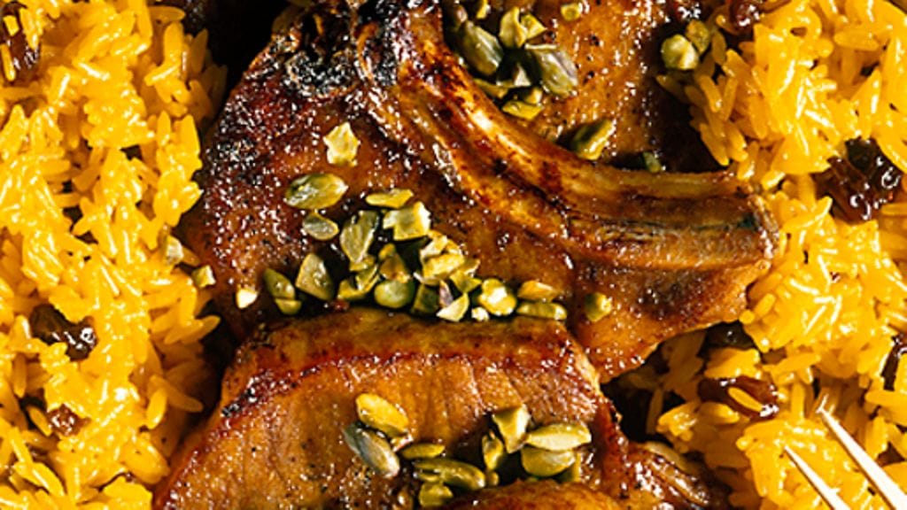 1. Paista riisiä ja sipulia pannussa, lisää sahrami. Lisää liemi. Keitä kannen alla n. 20 minuuttia. Lisää rusinat keittämisen lopussa.