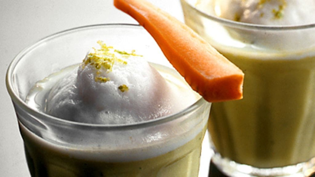 4. Kaada keitto kylmiin laseihin, laita päälle maitovaahtonokare, koristele raastetulla limenkuorella ja porkkanatangolla.