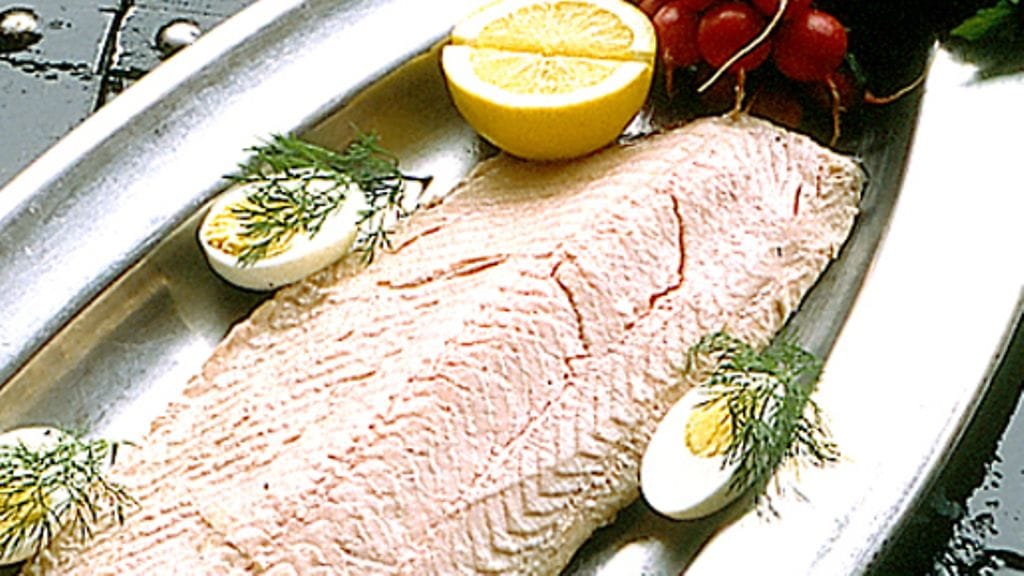 2. Huuhdo liivatelehdet vedellä. Voitele kalapadan ritilä tai voipaperiarkki ja aseta padan pohjalle. Laita lohifilee pataan nahkapuoli alaspäin, siivilöi päälle niin paljon lientä, että kala peittyy ja kuumenna hiljaa kiehuvaksi ilman kantta, kuori pois vaahto huolellisesti. Ota kattila liedeltä heti kun liemi alkaa poreilla ja laita huuhdellut liivatelehdet mukaan. Anna jäähtyä.