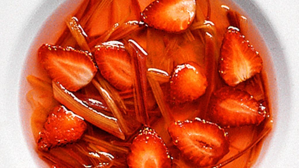 2. Kuori ja leikkaa raparperi tulitikun kokoisiksi suikaleiksi. Huuhtele mansikat ja poista kannat. Laita raparperitikut ja mansikat kuumaan liemeen.