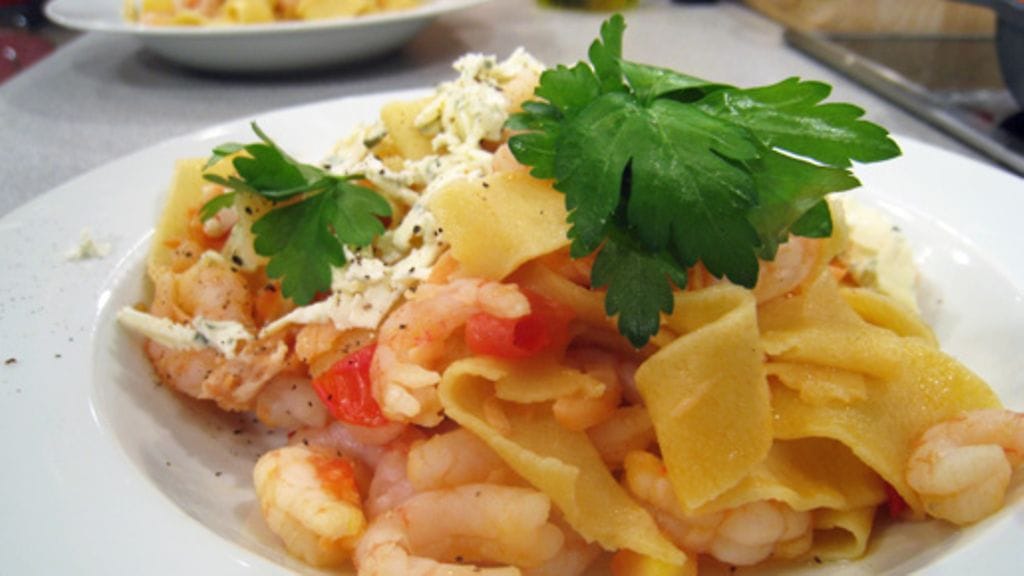 Kastike: Sulata katkaravut ja suikaloi kylmäsavulohi. Kuutioi tomaatit ja kuullota niitä öljyssä. Mausta rapuliemitiivisteellä ja sekoita kypsä, kuuma pasta joukkoon. Raasta pastan päälle lopuksi sinihomejuustoa.