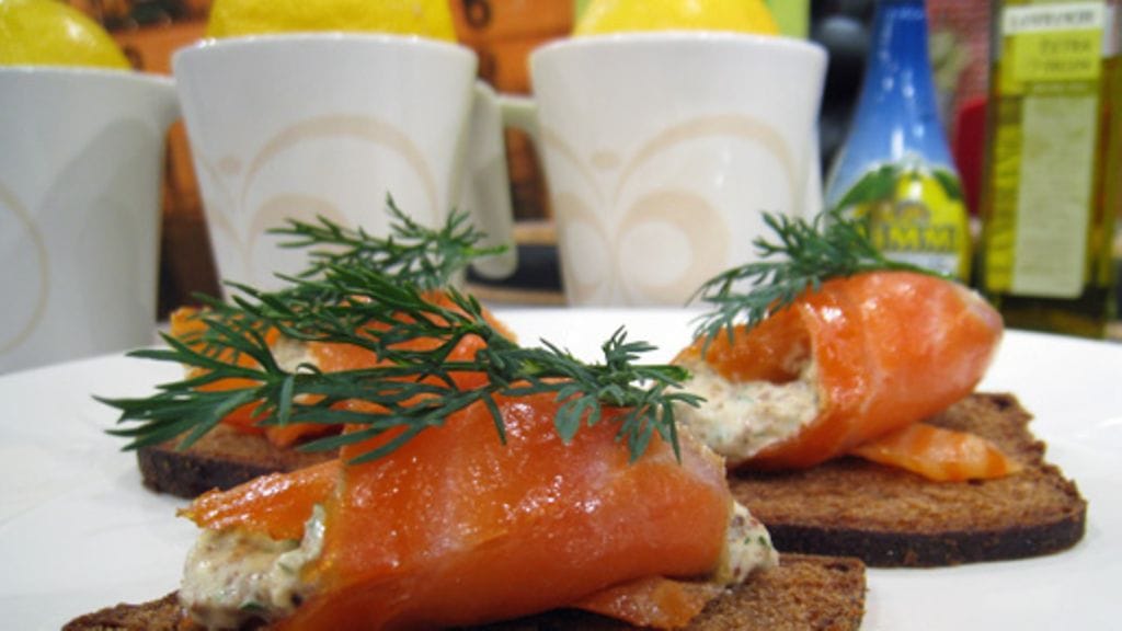 Aseta kylmäsavulohisiivut tuorekelmulle, kukin omalle palalleen. Levitä tahna kalalle ja kääri rullalle kelmua apuna käyttäen.