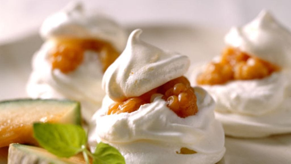 Kuumenna uuni 175-asteeseen. Erottele valkuaiset keltuaisista niin, ettei joukkoon pääse yhtään keltuaista. Vatkaa valkuaiset niin kovaksi vaahdoksi, että veitsellä leikatessa vaahtoon jää leikkausjälki.