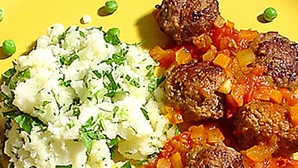 3. Paista muutama lihapulla kerrallaan maidottomassa margariinissa, 3-4 minuuttia. Tarjoile keitettyjen perunoiden kanssa. Vinkki: Tee taikina monitoimikoneessa. Sekoita keitetty peruna, sipuli, muna, suola, pippuri ja vesi. Lisää jauheliha nokareittain ja sekoita nopeasti taikinaksi.