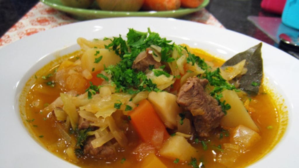 Lisää vesi ja mausteet. Keitä miedolla lämmöllä kannen alla noin tunti, kunnes lihat ja kasvikset ovat kypsiä.