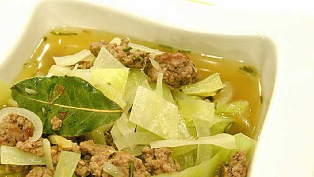 Leikkaa kaali hyvin ohuiksi suikaleiksi ja kuullota se kattilassa öljyssä pehmeäksi. Lisää joukkoon suikaloidut sipulit sekä kaikki mausteet ja kaada vesi mukaan. Anna kiehua miedolla lämmöllä 15 minuuttia ja ruskista sillä aikaa jauheliha pannulla rapeaksi.