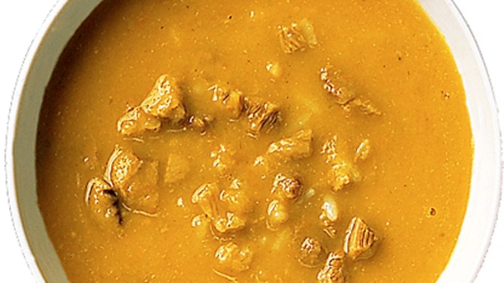 3. Nosta liha padasta, irrota liha luusta ja leikkaa pieniksi kuutioiksi. Kaada talteen puolet liemestä. Soseuta vihannekset lopun liemen kanssa. Laimenna vihannessose Talteen otetulla liemellä sopivan paksuiseksi keitoksi. Sekoita joukkoon liha, maapähkinävoi, sitruunamehu ja riisi. Mausta suolalla ja pippurilla.