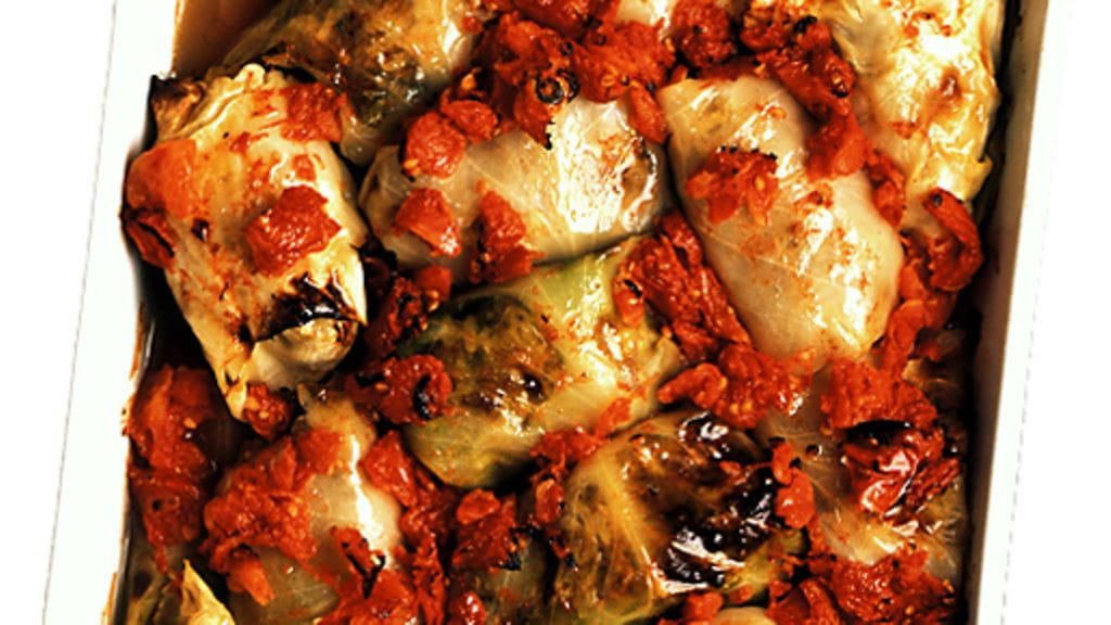 1. Kuumenna uuni 175 asteeseen. Leikkaa irti kaalin kanta. Kiehauta runsaasti vettä, lisää suola ja aseta kaalinkerä kattilaan kantapuoli ylöspäin. Irrota kaalinlehdet sitä mukaa kun ne pehmenevät. Valuta ja jäähdytä lehdet. Peitä 25 x 35 cm:n uuninpelti paksuilla ulommilla lehdillä. Nämä antavat kosteutta kääryleille kypsymisen aikana.