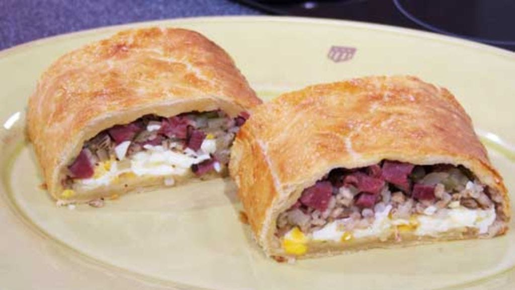 Hienonna kaikki ainekset. Laita voitaikina vuokaan. Laita hienonnetut ainekset kerroksittain taikinan päälle. Taita reunat kiinni. Voitele pinta vatkatulla kananmunalla. Paista 200-asteisessa uunissa noin 20-30 minuuttia.