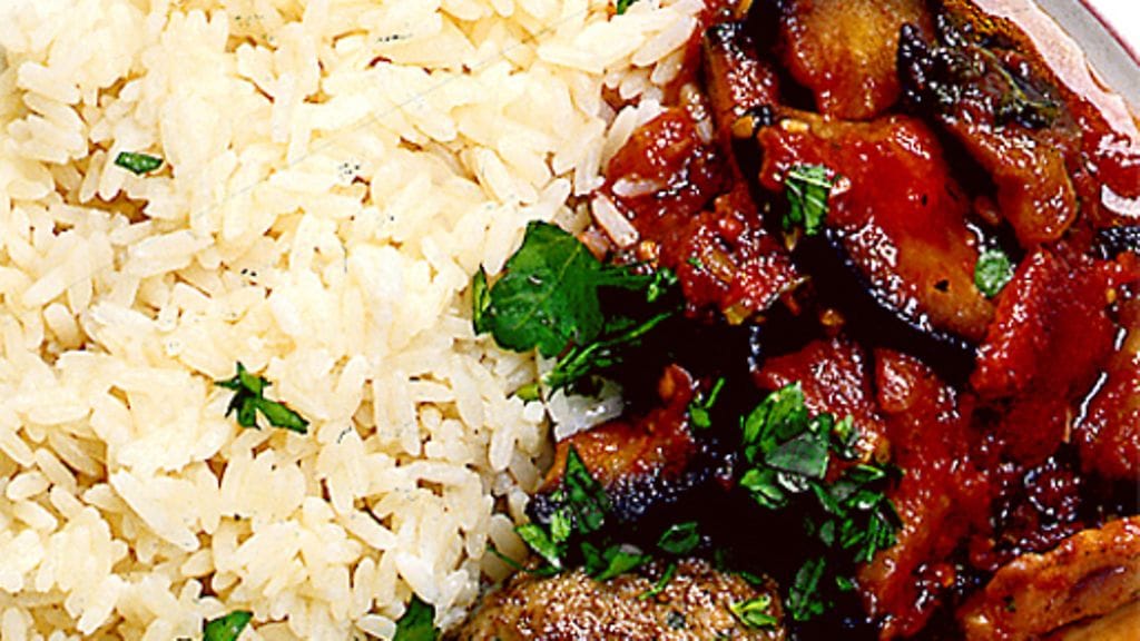 1. Leikkaa munakoiso viipaleiksi ja ne pienemmiksi paloiksi. Laita lävikköön vuorotellen munakoisopaloja ja suolaa, anna valua noin tunti. Kuori sipuli ja silppua puolikas. Paloittele tomaatit ja säästä liemi. Kuullota sipulisilppua ja munakoisopaloja öljyssä, kaada päälle tomaatit sekä liemi. Purista joukkoon valkosipulinkynsi ja mausta suolalla ja mustapippurilla. Anna kiehuskella ilman kantta 5 minuuttia.