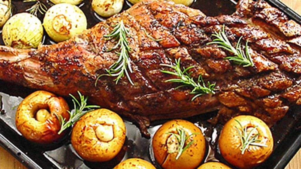 2. Kuori sipulit. Poista omenoista siemenkodat. Laita kuorittu valkosipulinkynsi jokaisen omenan sisään. Käännä paisti ja penslaa myös toinen puoli. Asettele sipulit vuokaan, penslaa myös ne mausteseoksella. Lisää hieman vettä vuokaan. Pistä paistolämpömittari lihan paksuimpaan kohtaan. Paista vielä 15 minuuttia.