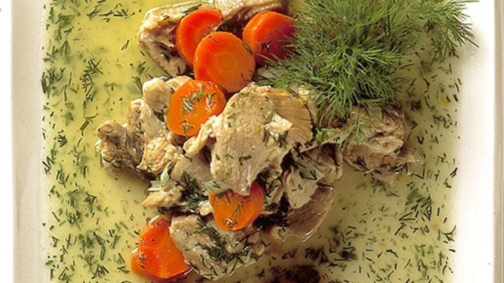 3. Asettele lihat lämmitettyyn tarjoilukulhoon. Viipaloi porkkana ja purjo ja asettele viipaleet lihojen päälle. Ripottele päälle paljon hienonnettua tilliä. Pidä lämpimänä.