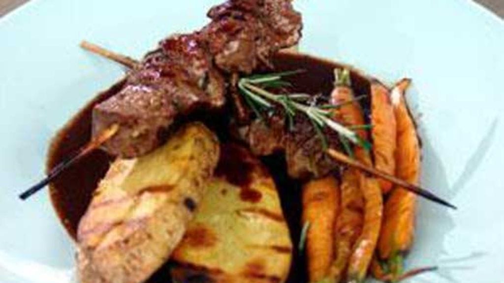 Grillaa nopeasti kuumalla grillillä ja anna vetäytyä rauhassa haaleammassa paikassa. Kiehauta demi-glace ja punaviini laakeassa astiassa ja mausta kastike suklaalla. Nosta vartaat sitten kastikkeeseen. Jos perunat ovat kovin suuria, pienennä niitä vähän ja nosta laakeaan kulhoon. Lorauta niihin oliiviöljyä ja mausta juustokuminalla ja suolalla. Jos pistelet myös perunat vartaaseen, niitä on helpompi käännellä, mutta ne voi kypsentää grillissä myös ilman vartaita.