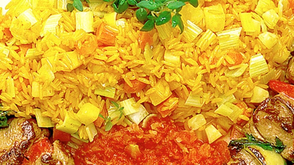 1. Sahramiriisi: Kiehauta 4 dl vettä ja mausta sahramilla ja ripauksella suolaa. Lisää veteen riisi. Kuori ja kuutioi porkkana ja juuriselleri ja viipaloi varsiselleri. Kuullota kasviksia hetki öljyssä. Keitä riisiä, kunnes kaikki vesi on imeytynyt ja riisi on kypsää. Sekoita joukkoon kasvikset.