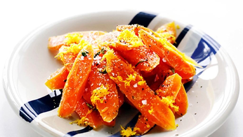 1. Kuori ja viipaloi porkkanat vinoiksi lanteiksi, noin sentin paksuisiksi. Pane ne kattilaan yhdessä appelsiinimehun kanssa ja keitä ne pehmeiksi. Nosta porkkanat liemestä ja jäähdytä.