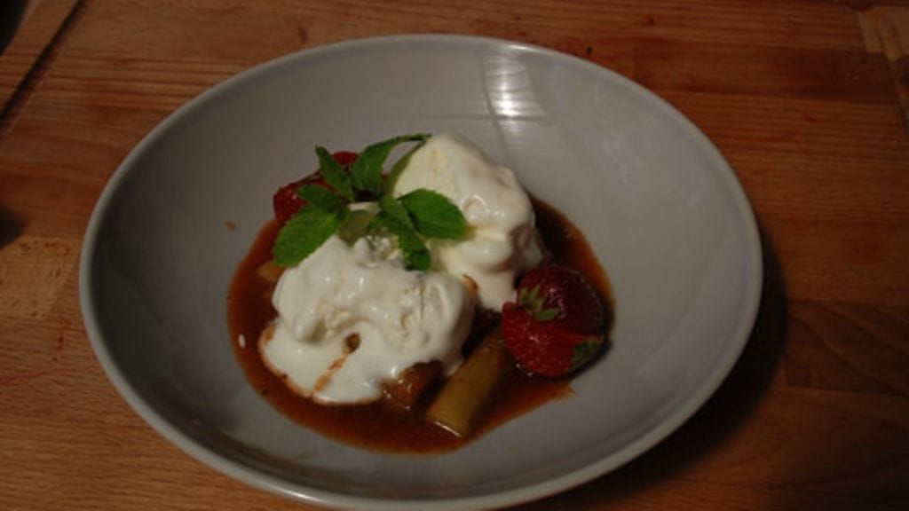 Raparperit ovat sopivan kypsiä silloin kun pysyvät vielä koossa ja ovat nosteltavissa. Tarjoa vaniljajäätelön kera.