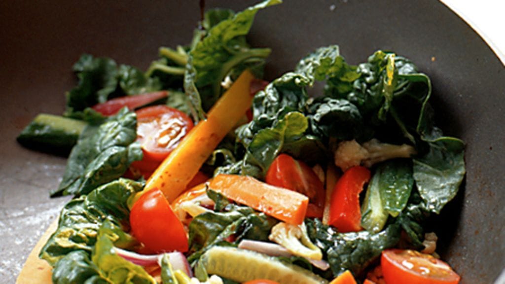 3. Anna salaatinlehtien lämmetä pannulla puolisen minuuttia. Asettele salaatinlehdet tarjoiluvadille ja lisää päälle kuullotetut vihannekset. Tarjoa heti.