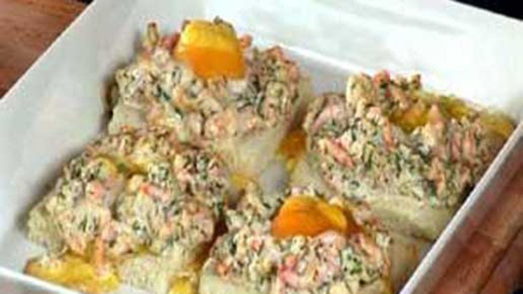 Kanttaa leivistä reunat pois. Leikkaa katkarapuja hieman veitsellä. Lisää majoneesi. Mausta pippurilla ja sitruunan mehulla. Leikkaa ruohosipuli tai tilli hienoksi ja sekoita joukkoon. Levitä jokaiselle leivälle runsaasti katkarapumassaa ja tee keskelle pieni kuoppa. Erottele kananmunista keltuaiset ja aseta varovasti leivän keskelle kuoppaan.