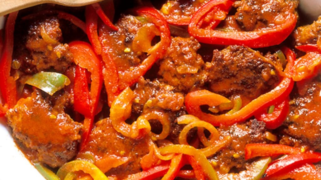 2. kuullota sipuli- ja paprikaviipaleita voissa padassa. Lisää tomaattipyree, ja pilkotut tomaatit. Kaada joukkoon lihaliemi. Mausta ja keitä 20 minuuttia.
