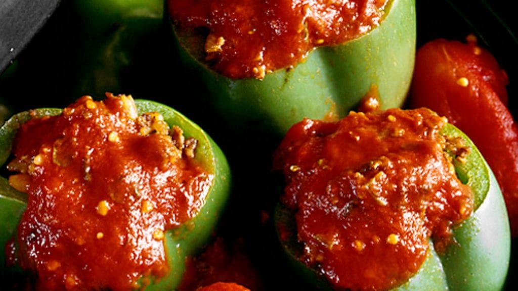 3. Sekoita jauhelihaan muut ainekset paitsi tomaattimurska, ja täytä paprikat. Laita ne pataan ja kaada ympärille tomaattimurskaa, mausta timjamilla.
