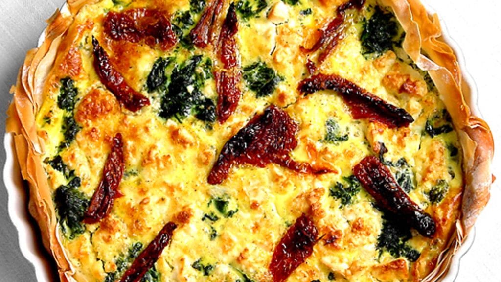 4. Puristele varoen pinaatista sula vesi pois ja asettele pinaatit vuokaan. Suikaloi tomaatit ja asettele pinaatin päälle. Murusta lampaanjuusto päälle.