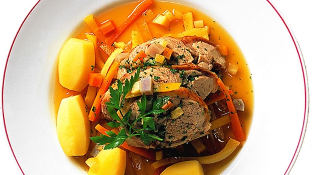 1. Kääri liha rullalle ja sido se tiukasti paistolangalla. Kuori porkkana, sipuli ja selleri ja paloittele isoiksi paloiksi. Laita liharulla pataan juuresten ja mausteiden kera ja kaada päälle lihalientä sen verran, että liha juuri ja juuri peittyy. Keitä miedolla lämmöllä kannen alla 1 - 1 1/2 tuntia tai kunnes liha tuntuu murealta. Kuori muodostuva vaahto silloin tällöin. Ota kypsä liha padasta ja pidä se lämpimänä.