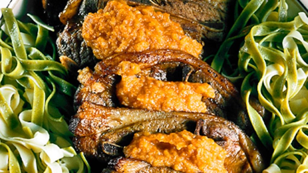 2. Mausta lihat, paista 3-4 minuuttia puoleltaan. Kaada ½ dl vettä pannulle, sulje kansi ja jälkipaista 5 minuuttia. Tarjoile vihannessoseen ja nuudeleiden kanssa.