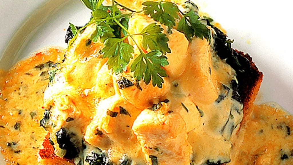 3. Paista leipäviipaleet voissa kullanruskeiksi. Levitä jokaiselle leipäviipaleelle kerros pinaattia. Lusikoi broilerimuhennos pinaatin päälle. Peitä muhennos muutamalla juustoviipaleella. Gratinoi voileipiä 5-6 minuuttia tai niin kauan, että juusto saa kauniin värin.