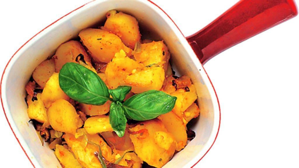 2. Kuullota sipuli ja purjo ja purjo oliiviöljyssä. Lisää perunaviipaleet, valkosipuli ja kurkuma, ripottele joukkoon sahrami ja paista, kunnes kaikki neste on haihtunut ja ainekset ovat saaneet väriä.