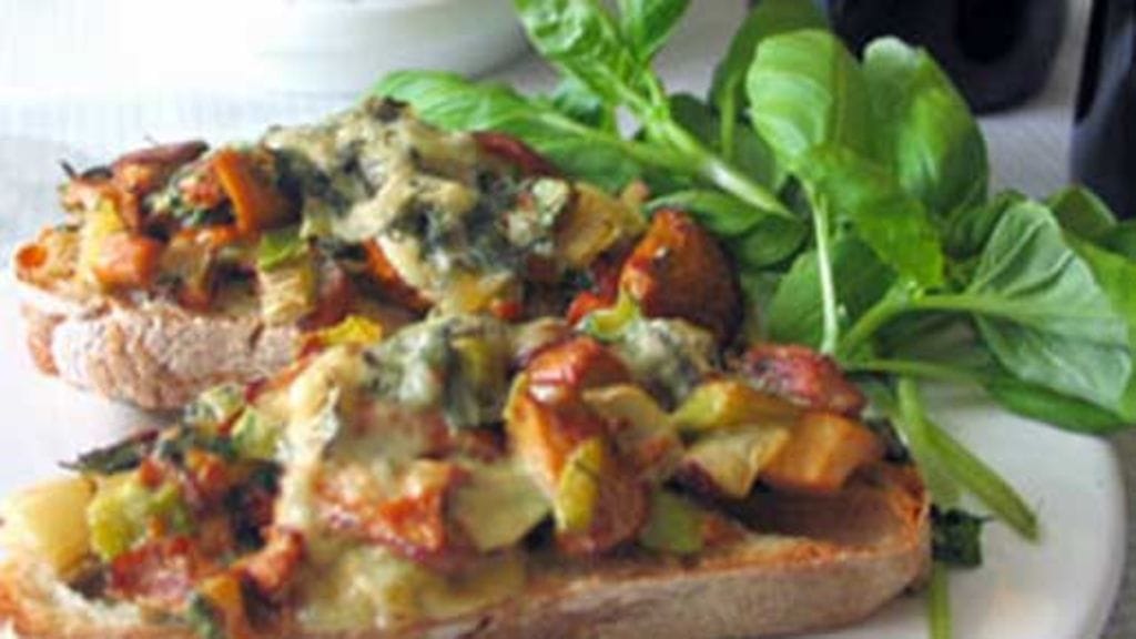 Kaada pannulle kerma ja anna kiehua hetki. Mausta suolalla, pippurilla ja haluamallasi yrteillä (esim. timjami ja basilika sopivat hyvin). Jaa sienisipuliseos leipäviipaleille ja lisää päälle mieleisesi juusto. Kuumenna, kunnes juusto sulaa.