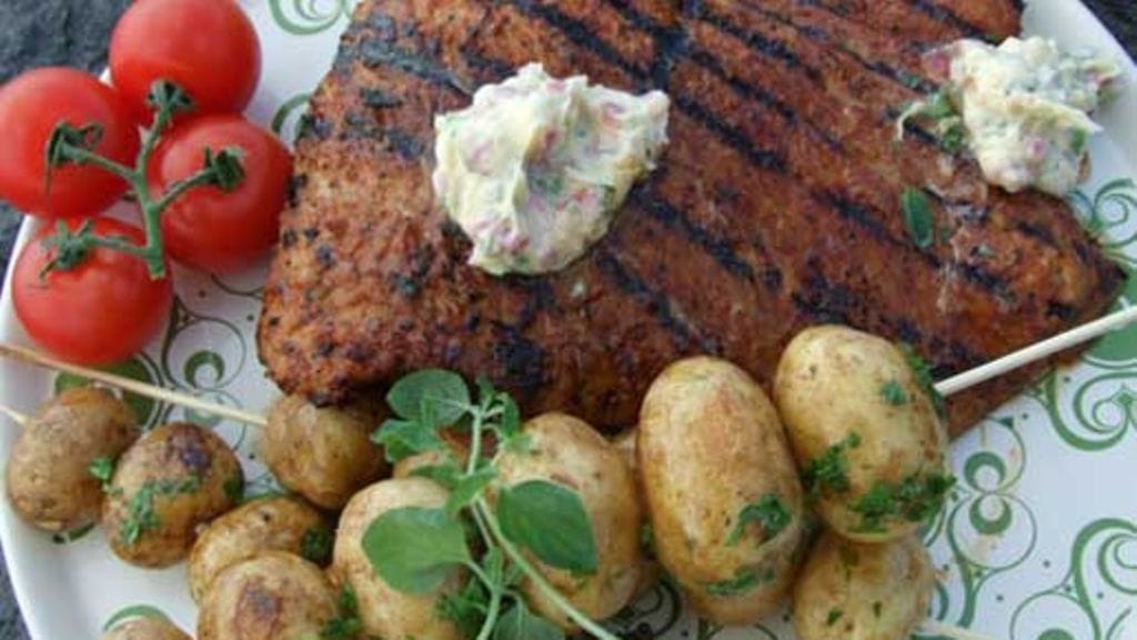 Kaavi maustemarina pinnalta pois ja nosta pihvi grilliin. Paista n. 2-3 min per puoli ja käännä. Tarkista pihvin kypsyys ja herkuttele maustevoin kera.