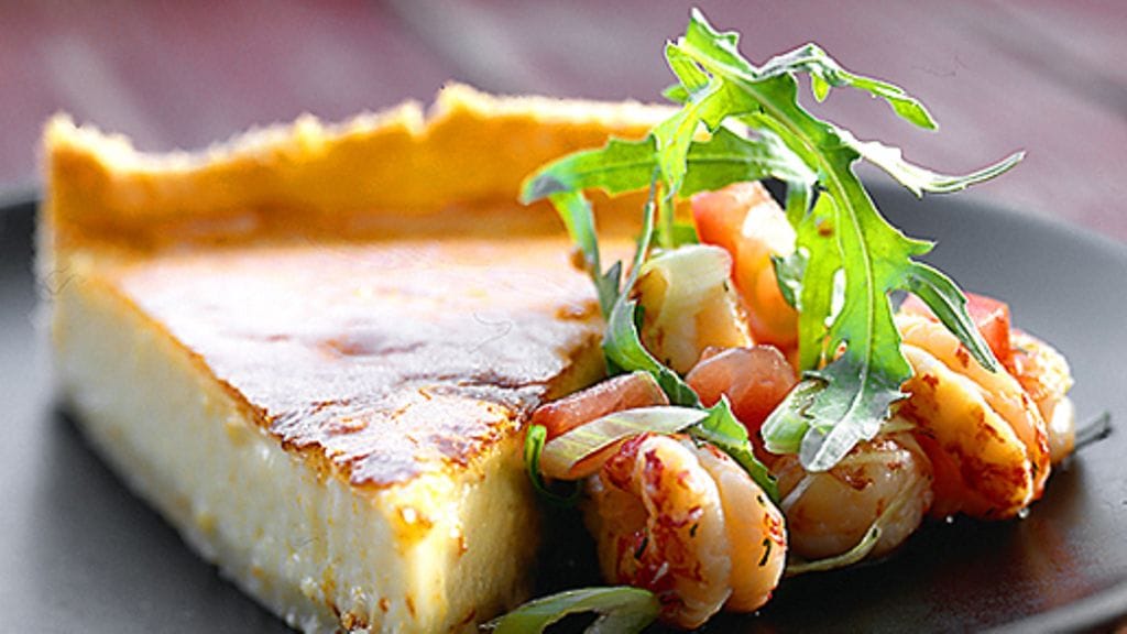 3. Paista uunissa noin 30 minuuttia, kunnes munamaito on hyytynyt. Anna piiraan jäähtyä kokonaan ennen kuin leikkaat sen palasiksi. Valuta ravunpyrstöt lävikössä. Leikkaa tomaatit lohkoiksi, suikaloi puhdistettu purjo vinottain. Sekoita keskenään ravunpyrstöt, purjosuikaleet ja rucolanlehdet sekä tomaattilohkot, purista päälle sitruunamehua ja jaa seos aseteille. Leikkaa piiras kolmioiksi ja tarjoile rapusalaatin kanssa.