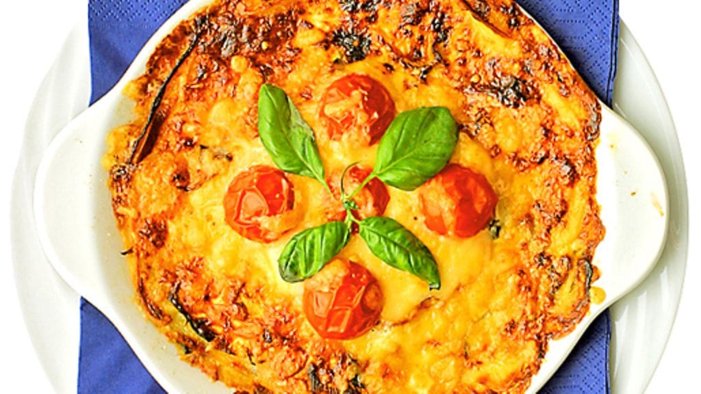 3. Ota vuoka uunista ja levitä sen pinnalle halkaistut kirsikkatomaatit. Ripottele pinnalle myös juustoraaste ja loppu basilika. Jatka gratinoimista vielä 10 minuuttia